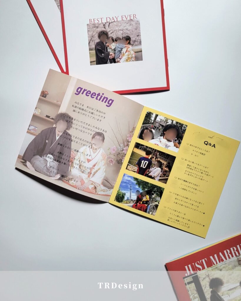 ホームGALLERY 制作事例35 *ページ構成P1…表紙P2…ご挨拶P3…Q&AP4-P5…席次表P6…メニューP7…写真集P8…裏表紙1ページずつカラーを変えたTRDesign人気のデザイン◎正方形でよりかわいくポップな印象に仕上がります*