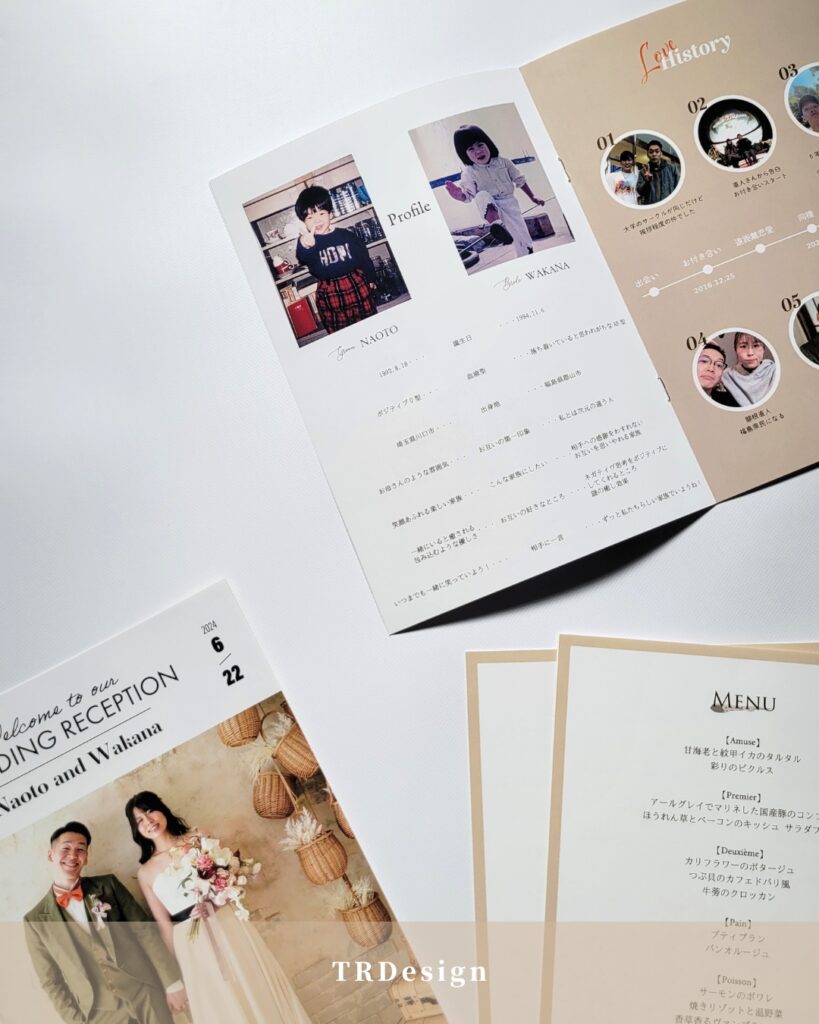 ホームGALLERY 制作事例38 *ページ構成P1…表紙P2-P3…ご挨拶P4…プロフィールP5…なれそめP6-P7…席次表P8…メニューベージュメインでやわらかいお色味の1冊*プロフィールも充実しておりお二人の人柄がしっかり伝わります◎